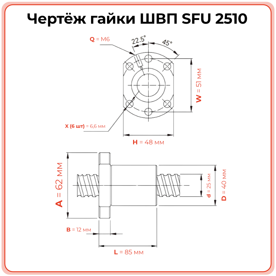 SFU2510 рассчитана на диаметр винта 25 мм с шагом 10 мм и обеспечивает более высокую скорость линейной подачи, чем SFU2505 с шагом 5 мм. В сравнении с гайками меньшего шага её применяют там, где приоритетом является скорость и производительность, а не максимальная точность позиционирования. - Какие требования к смазке и обслуживанию узла ШВП 25X10?