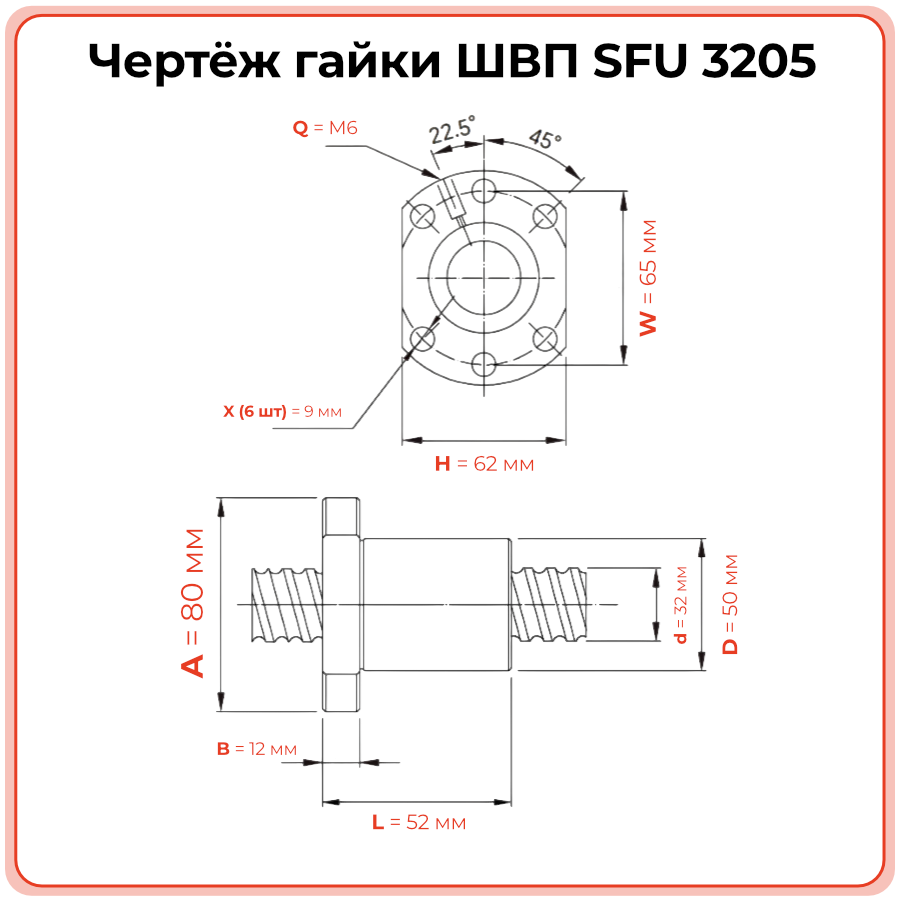 SFU3205 рассчитана на диаметр винта 32 мм с шагом 5 мм и обеспечивает более точную подачу при меньшем ходе за оборот, чем SFU3210 с шагом 10 мм. В сравнении с гайками большего шага её выбирают там, где приоритетом являются точность и плавность позиционирования, а не максимальная скорость. - Какие требования к смазке и обслуживанию узла ШВП 32X5?