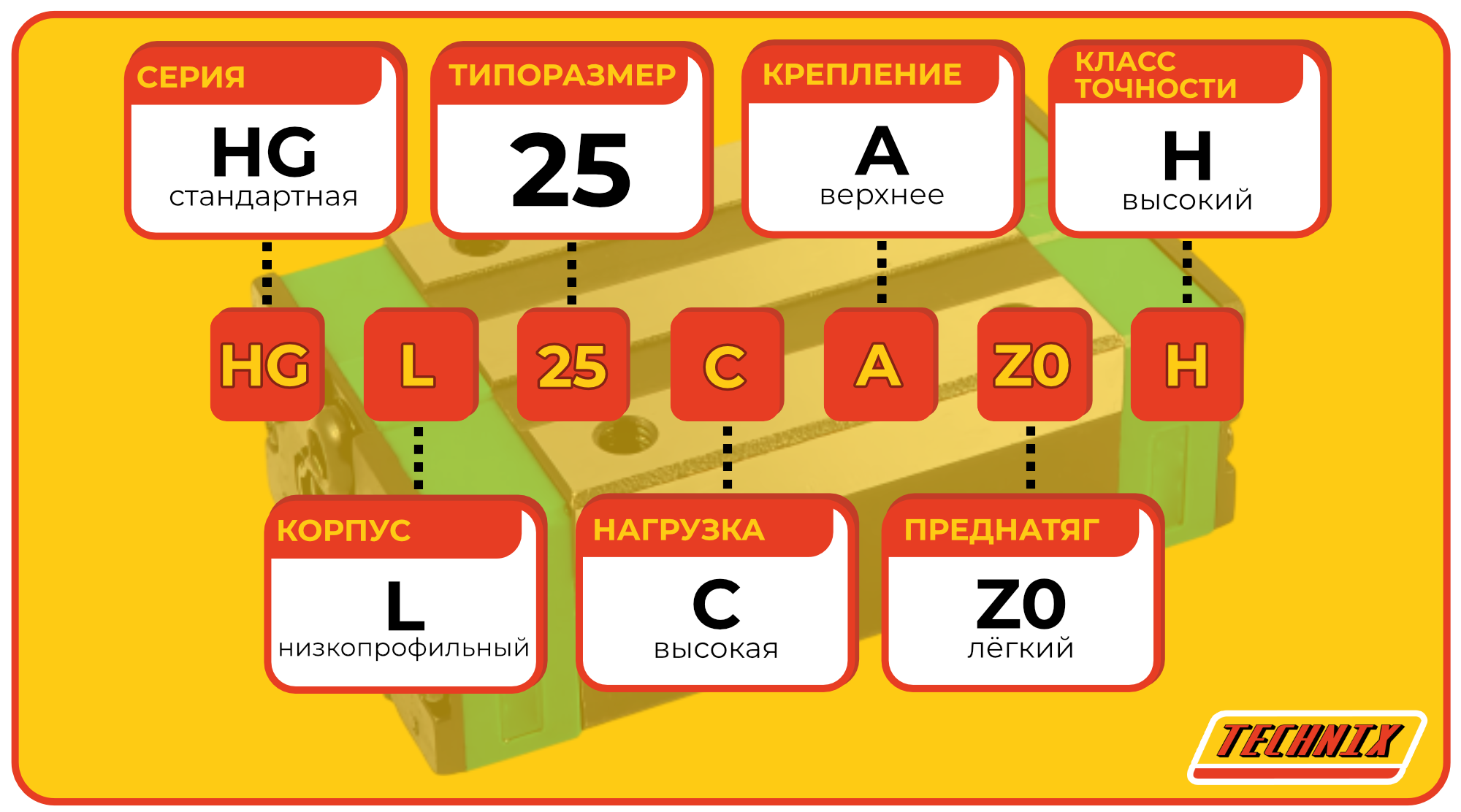 Линейная каретка HGL25CAZA0H TECHNIX — низкопрофильный блок направляющей для промышленных систем