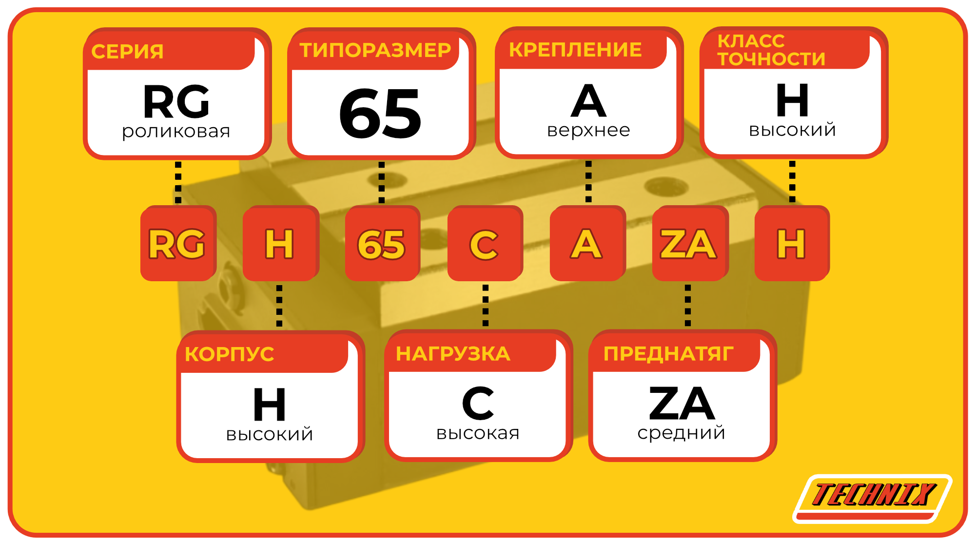 Каретка RGH65CAZAH TECHNIX предназначена для работы в условиях повышенных нагрузок и вибраций. Обеспечивает тяжёлую нагрузку (C), верхнее крепление (A), стабильный контакт благодаря среднему преднатягу (ZA) и высокая точность (H).