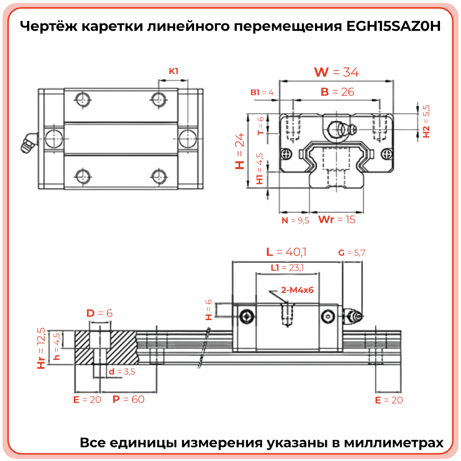 Опорный блок низкопрофильный EGH15SAZ0H крепится сверху (обозначение A), что даёт возможность удобного монтажа в различных конструкциях. Каретка оснащена герметичными уплотнителями, которые защищают от загрязнений и пыли, а система подачи смазки обеспечивает долговечность и надёжность при минимальном обслуживании.