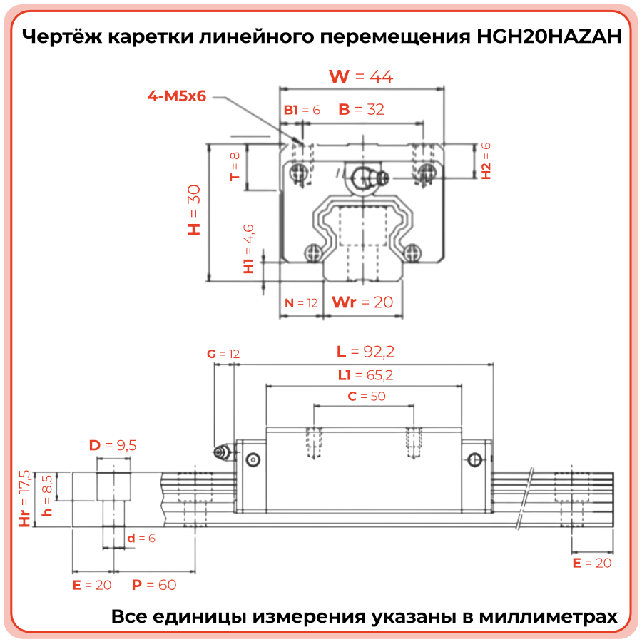 Линейная каретка HGH20HAZAH TECHNIX — высокий блок направляющей для промышленных систем