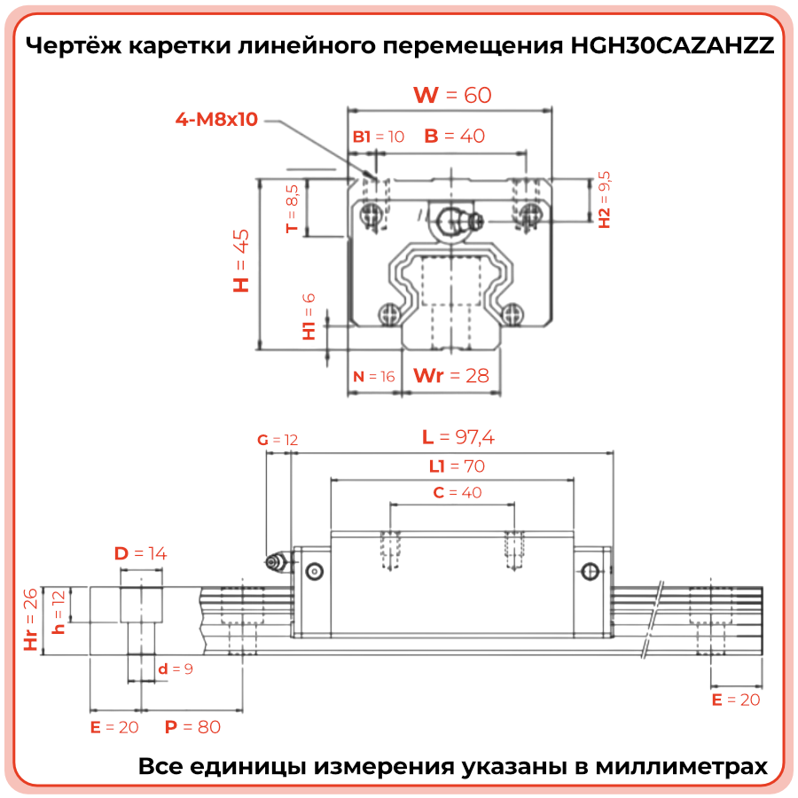 Каретка крепится сверху, преднатяг — ZA, высокий класс точности, с двусторонними уплотнениями. Корпус выполнен из закалённой стали с прецизионной шлифовкой направляющих поверхностей, а смазочные каналы позволяют легко обслуживать блок без демонтажа.