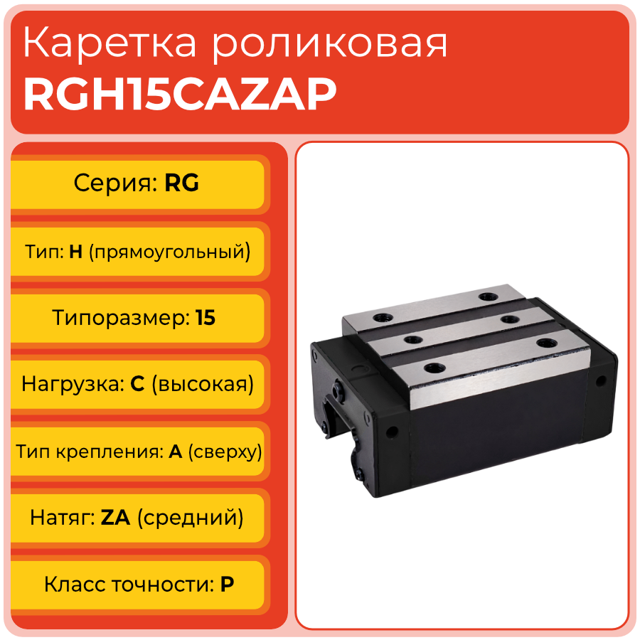 Каретка RGH15CAZAP TECHNIX относится к роликовой серии RG, рассчитана на тяжёлую нагрузку (C), крепится сверху (A), имеет средний преднатяг (ZA) и прецизионный класс точности (P). Предназначена для направляющих шириной 15 мм.