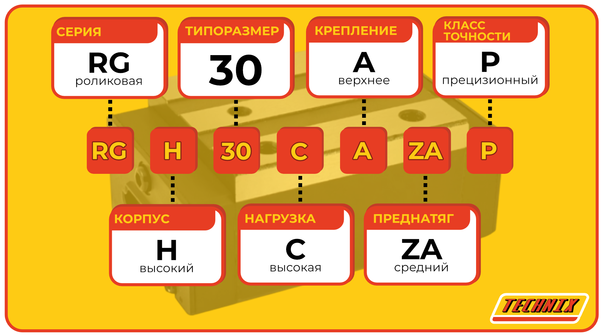 Каретка RGH30CAZAP TECHNIX представляет собой роликовую модель с высокой несущей способностью, предназначенную для использования в точных системах линейного перемещения. Обозначение C указывает на возможность работы под тяжёлой нагрузкой, A — крепление каретки осуществляется сверху, ZA —средний уровень преднатяга, обеспечивающий стабильный контакт без люфта, а P — прецизионный класс точности.