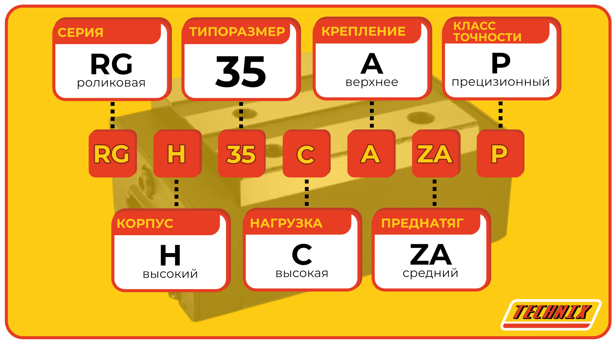 Каретка RGH35CAZAP TECHNIX спроектирована для применения в условиях высокой точности и тяжёлых нагрузок. Индексы C-A-ZA-P указывают на тяжёлую нагрузку, верхнее крепление, средний преднатяг и прецизионный класс точности соответственно. Ширина направляющей — 35 мм.