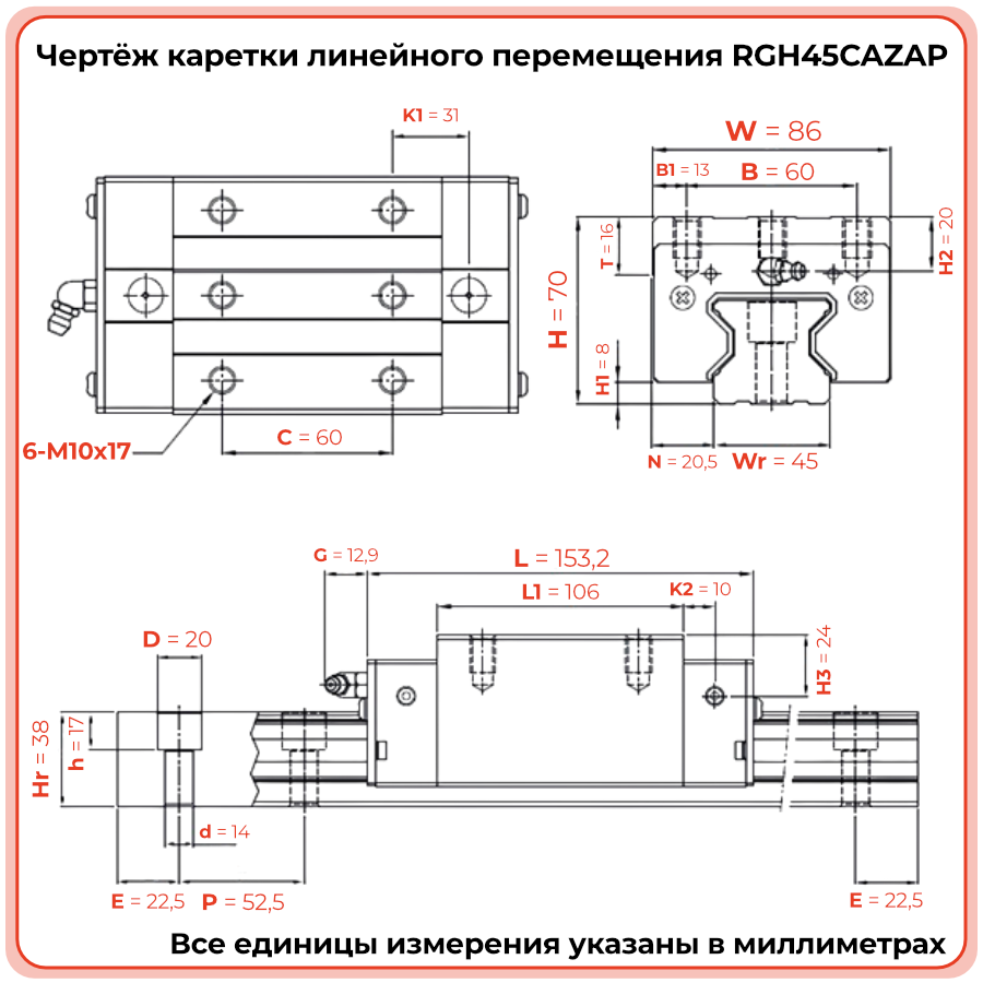 Каретка RGH45CAZAP TECHNIX — роликовая линейная каретка для направляющих 45 мм