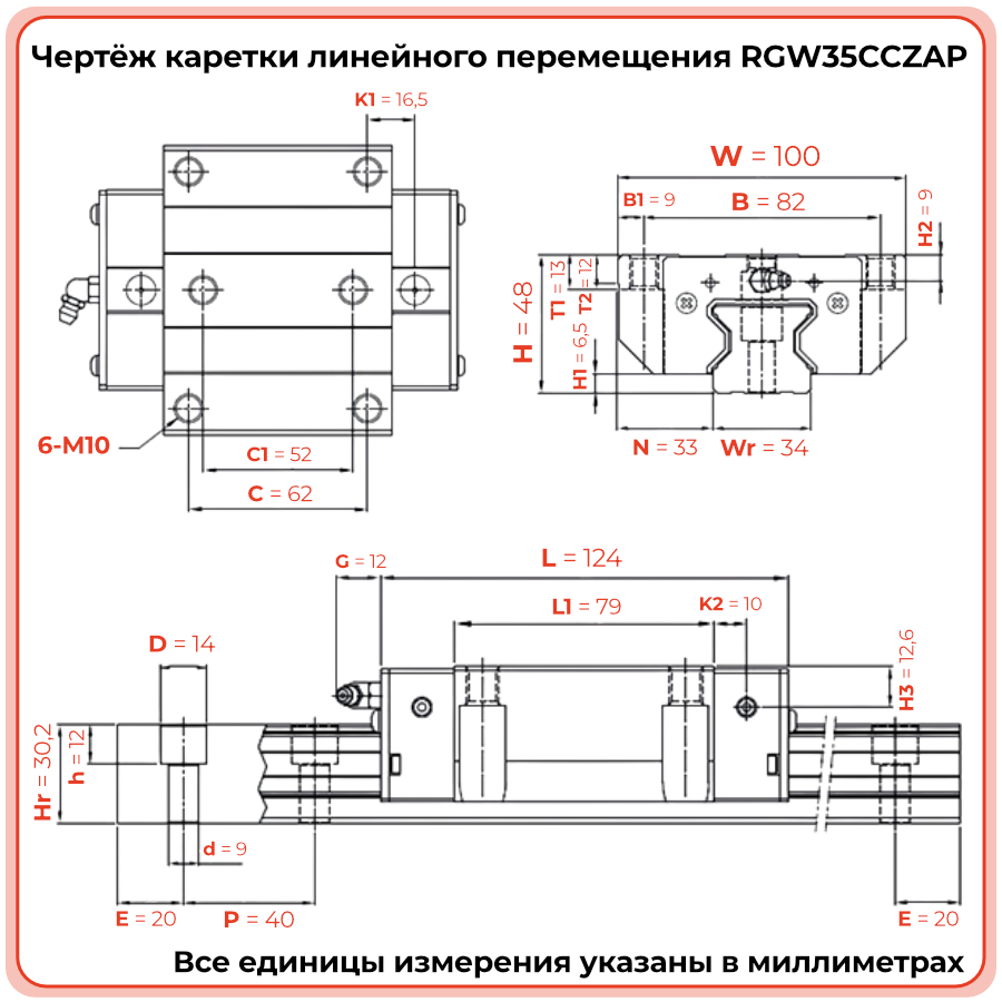 Каретка RGW35CCZAP TECHNIX — роликовая линейная каретка с широкой базой для тяжёлых нагрузок