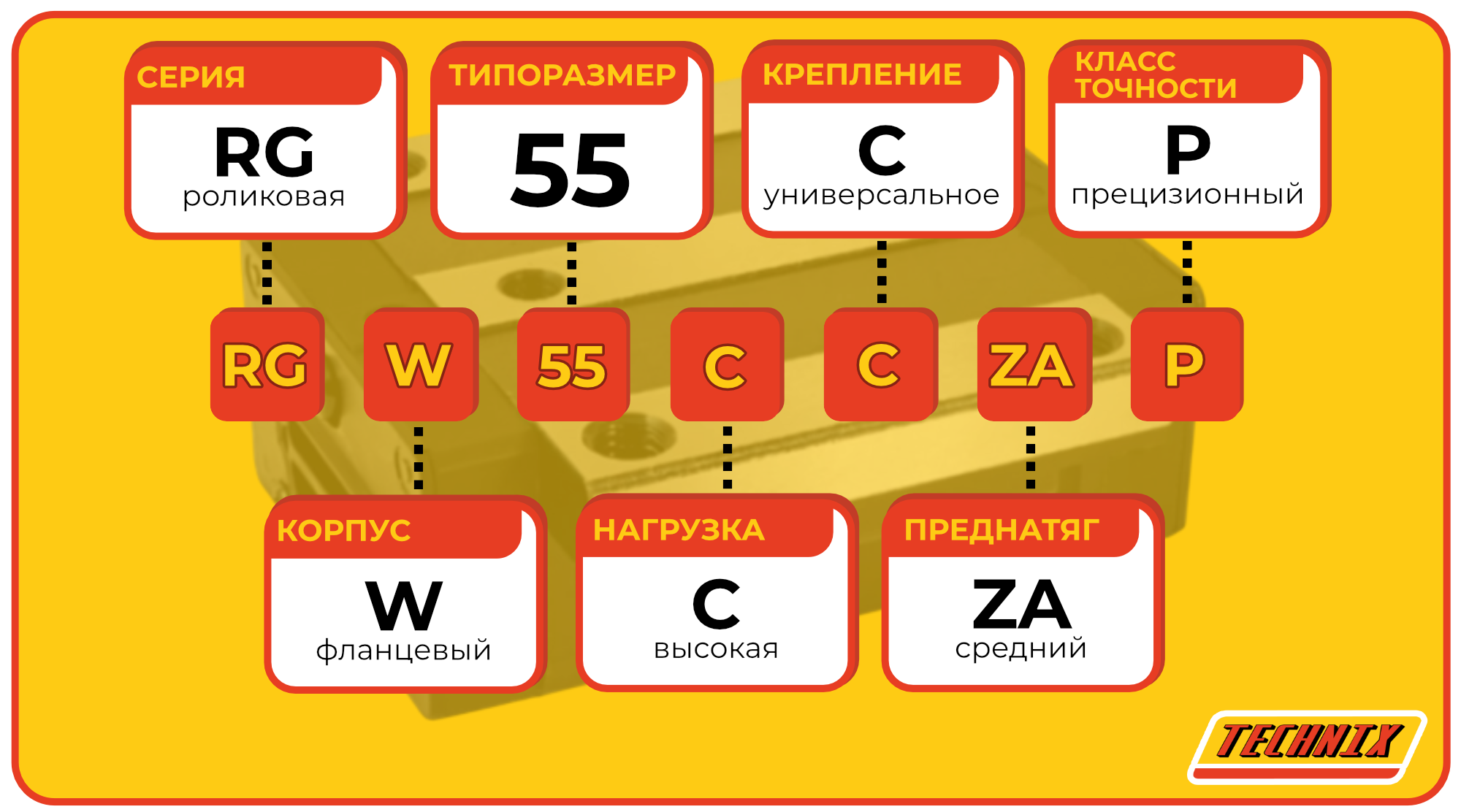 Модель RGW55CCZAP TECHNIX разработана для направляющих шириной 55 мм. Широкая база (W), тяжёлая нагрузка (C), универсальное крепление (C), средний преднатяг (ZA) и прецизионная точность (P) делают её отличным выбором для портальных систем и металлообрабатывающих установок.