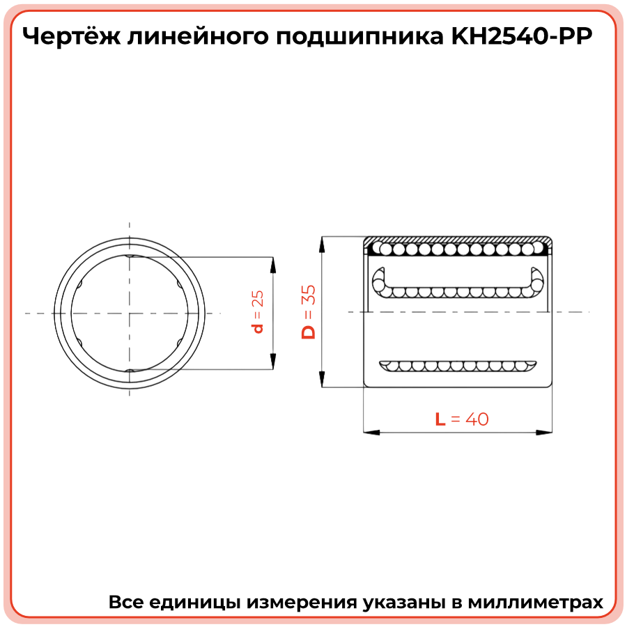 KH — серия компактных бесфланцевых линейных подшипников; 25 — внутренний диаметр (вал Ø25 мм); 40 — длина корпуса (40 мм); PP — два полимерных уплотнения (по одному с каждого торца).