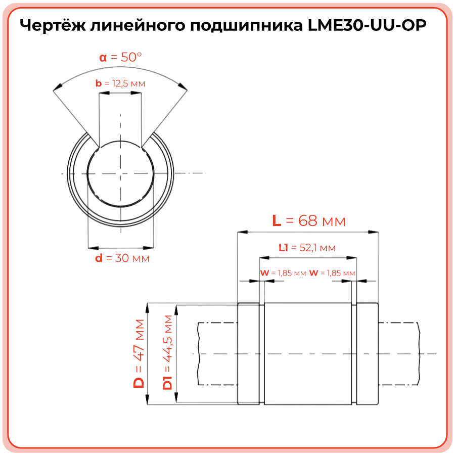 Контрольные признаки: радиальный зазор более 0,05 мм, нестабильный ход под нагрузкой, металлический шум, следы питтинга или трещины на дорожках качения. Плановая замена - через 1000–1500 часов наработки или по результатам осмотра. - Чем LME30-UU-OP отличается от LME30-UU?