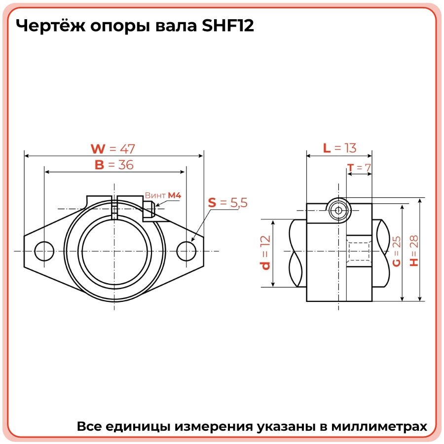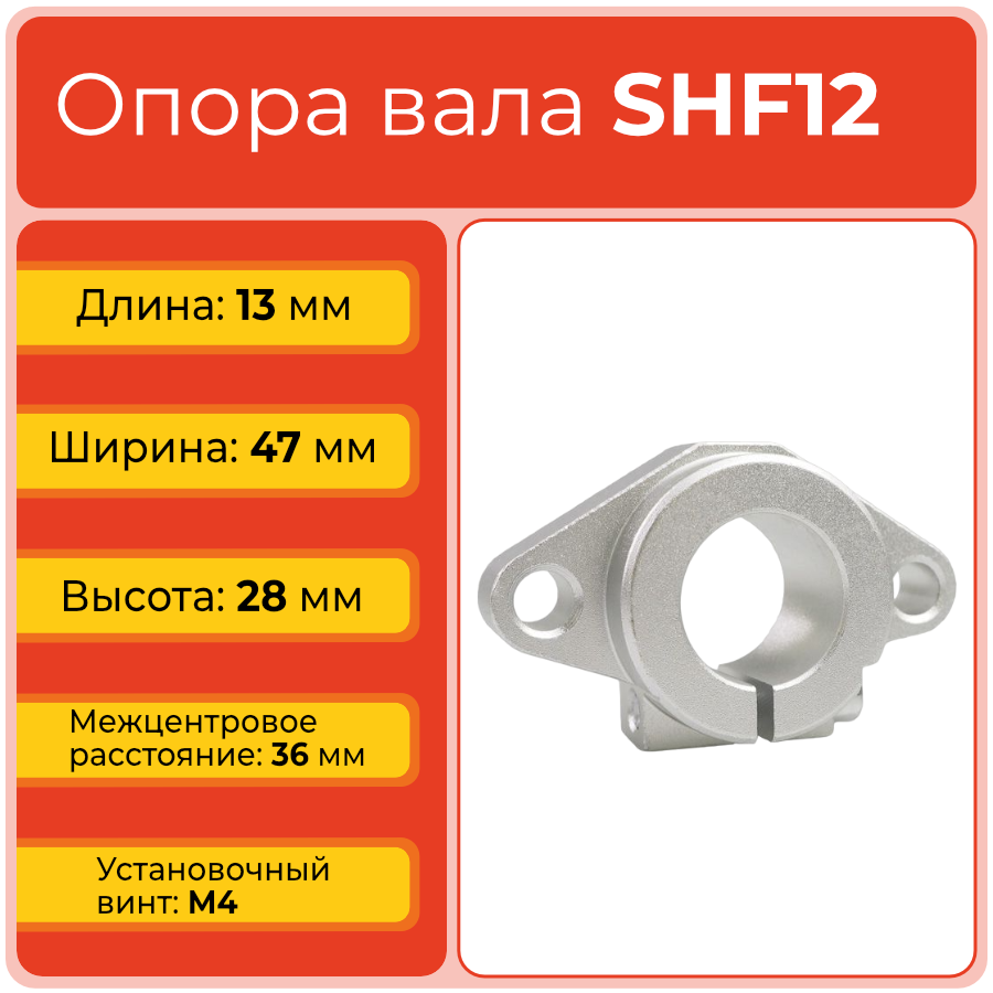 Опора вала SHF12 сделана из дюралюминия, благодаря чему имеет легкий вес и высокую прочность. Опора надежно фиксирует вал параллельно опорной плоскости и обеспечивает высокую точность и скорость его работы. Крепится к основанию с помощью фланцевого соединения. Держатель вала крепится к монтажной поверхности двумя винтами со стандартной резьбой. Для фиксации вала на опоре имеется винтовое соединение.