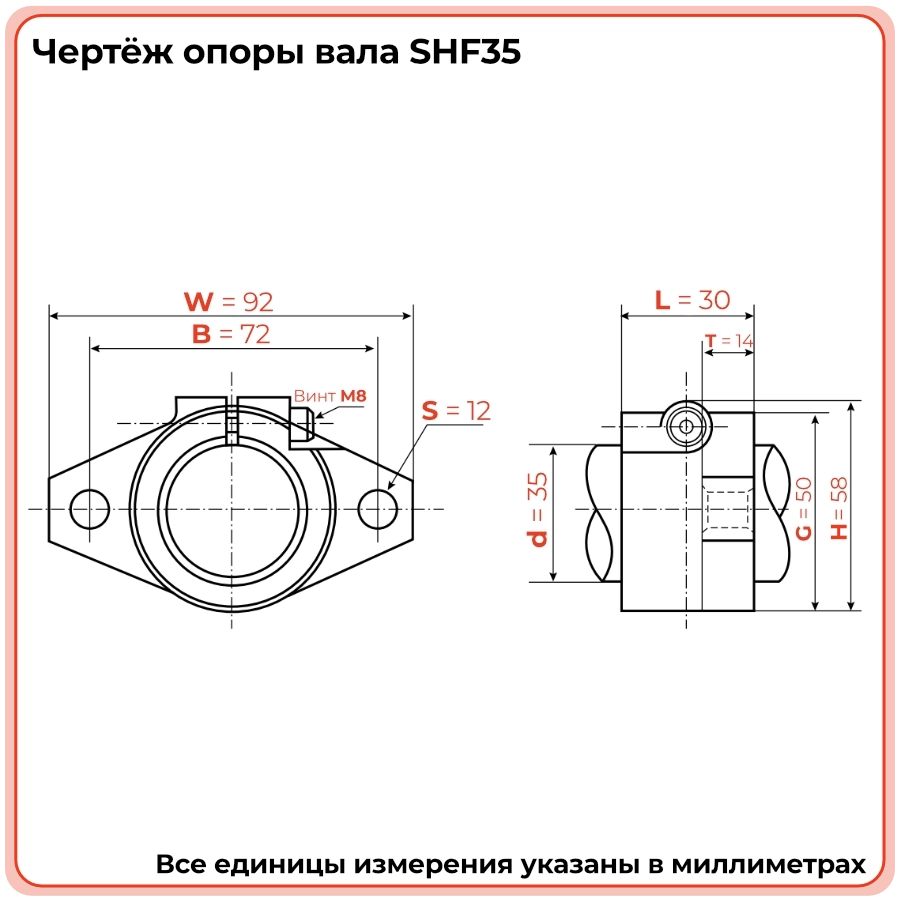 Опора вала SHF35 сделана из дюралюминия, благодаря чему имеет легкий вес и высокую прочность. Опора надежно фиксирует вал параллельно опорной плоскости и обеспечивает высокую точность и скорость его работы. Крепится к основанию с помощью фланцевого соединения. Держатель вала крепится к монтажной поверхности двумя винтами со стандартной резьбой. Для фиксации вала на опоре имеется винтовое соединение.