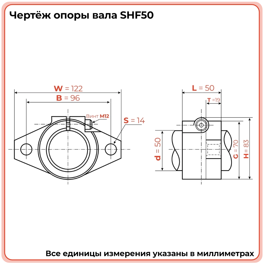 Опора вала SHF50 сделана из дюралюминия, благодаря чему имеет легкий вес и высокую прочность. Опора надежно фиксирует вал параллельно опорной плоскости и обеспечивает высокую точность и скорость его работы. Крепится к основанию с помощью фланцевого соединения. Держатель вала крепится к монтажной поверхности двумя винтами со стандартной резьбой. Для фиксации вала на опоре имеется винтовое соединение.