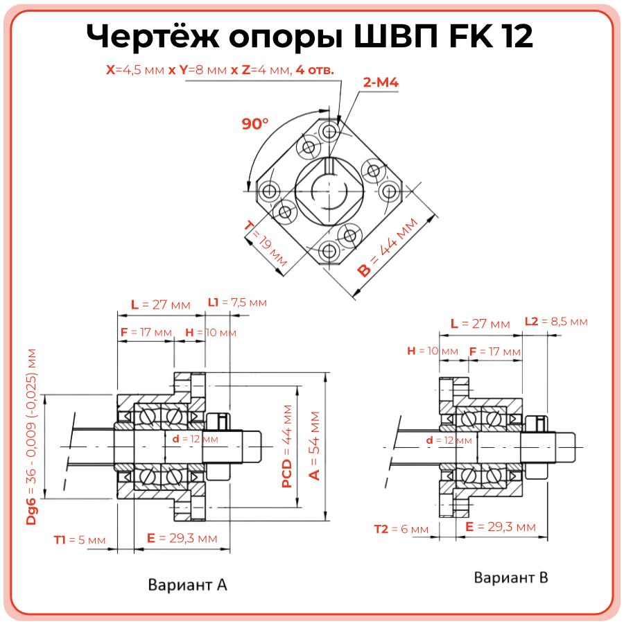 Опора FK12TECHNIX выполнена в виде гнездового корпуса с квадратным фланцем и прецизионным посадочным гнездом под два подшипника 6001ZZ, формирующих радиально-упорный подшипниковый блок. Внутреннее отверстие диаметром 12 мм предназначено для установки обработанного конца винта ШВП, который фиксируется резьбовой фиксирующей гайкой M12×1 и ограничительными элементами. Четыре крепёжных отверстия под винты М4 с зенковкой под шляпку обеспечивают жёсткий и аккуратный монтаж опоры на монтажную плиту или станину.