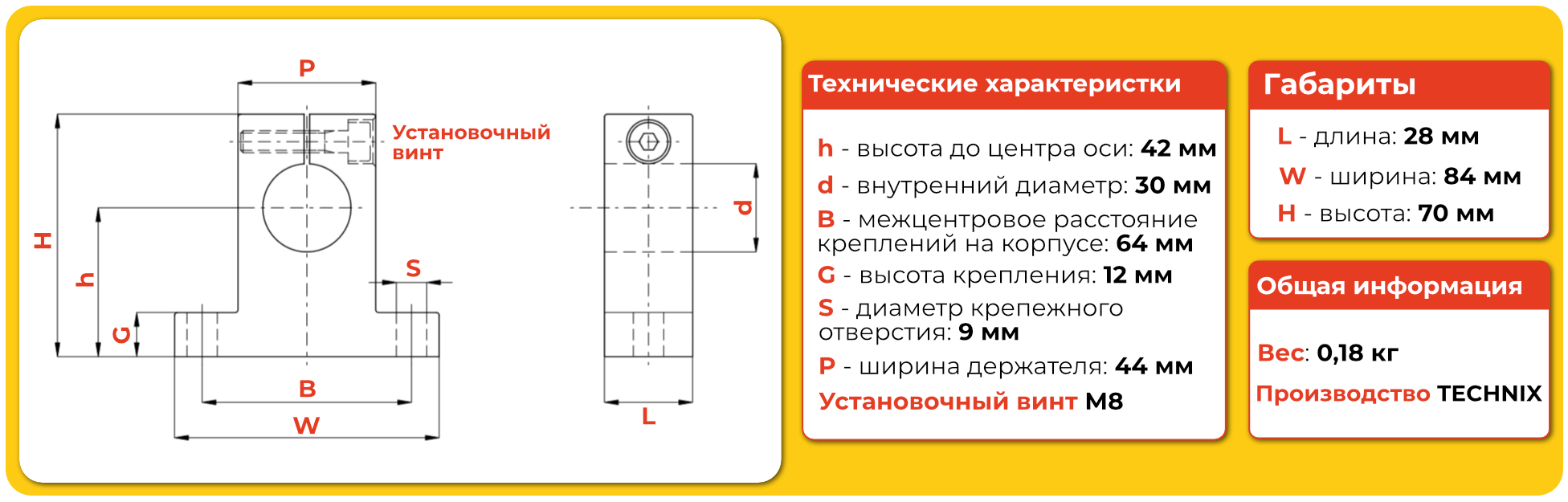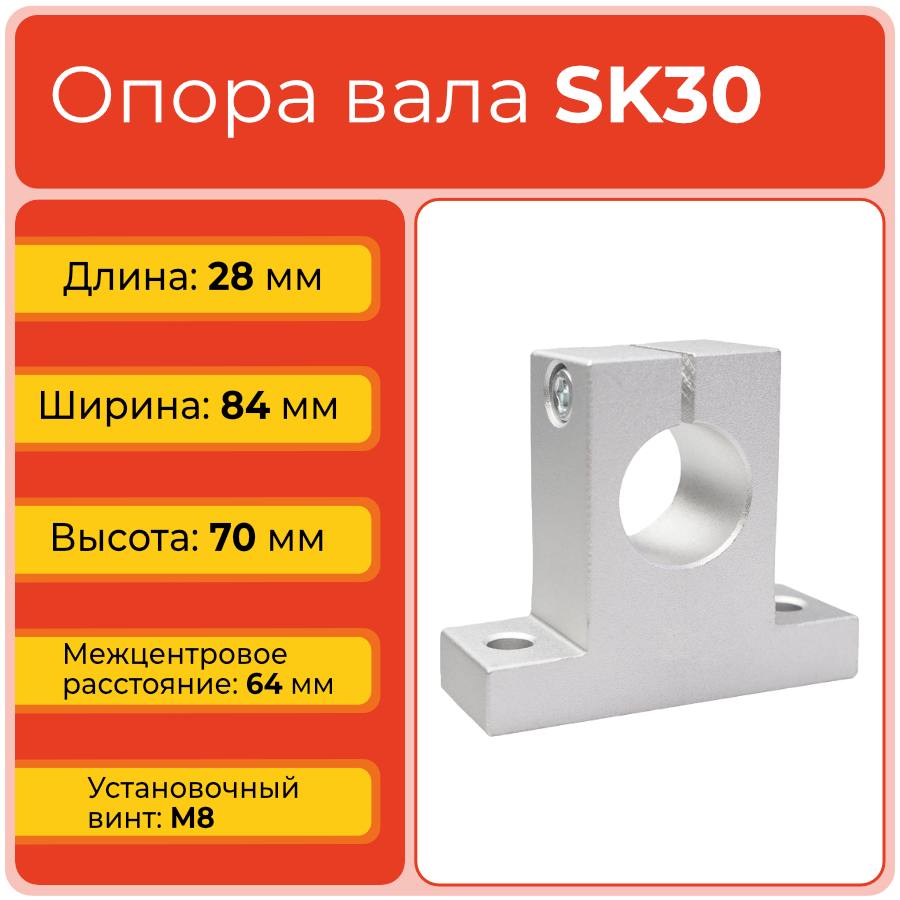 Опора вала SK30 сделана из дюралюминия, благодаря чему имеет легкий вес и высокую прочность. Опора надежно фиксирует вал параллельно опорной плоскости и обеспечивает высокую точность и скорость его работы. Крепится к основанию с помощью лапок на корпусе. Держатель вала крепится к монтажной поверхности двумя винтами со стандартной резьбой. Для фиксации вала на опоре имеется винтовое соединение.