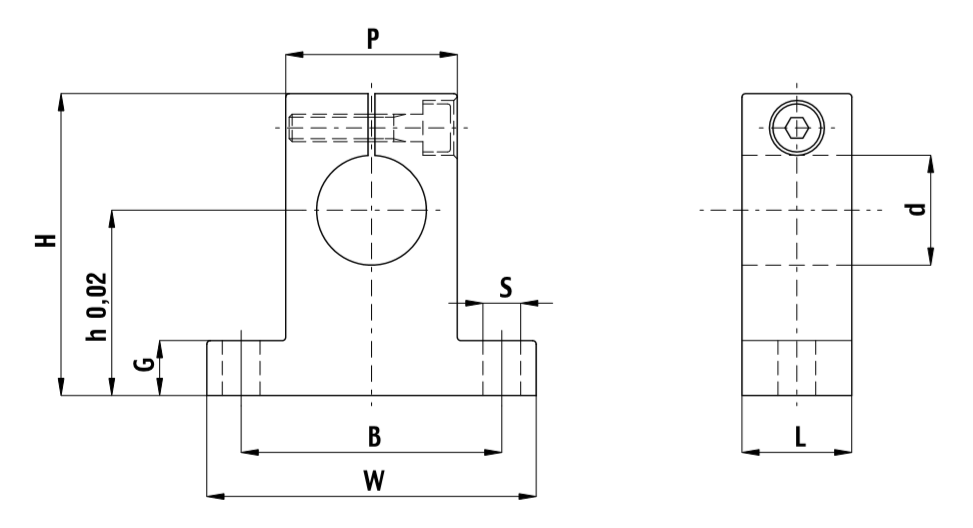 Опора вала SK60 сделана из дюралюминия, благодаря чему имеет легкий вес и высокую прочность. Опора надежно фиксирует вал параллельно опорной плоскости и обеспечивает высокую точность и скорость его работы. Крепится к основанию с помощью лапок на корпусе. Держатель вала крепится к монтажной поверхности двумя винтами со стандартной резьбой. Для фиксации вала на опоре имеется винтовое соединение.