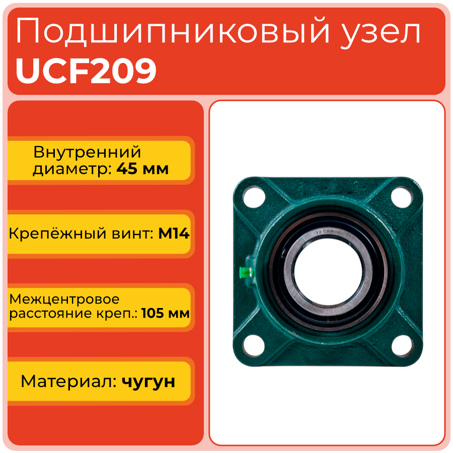 Подшипниковый узел UCF209 TECHNIX – корпусная опора с квадратным фланцевым корпусом F209 и корпусным подшипником UC209 для вала диаметром 45 мм, рассчитанная на работу под значительными радиальными и осевыми нагрузками.