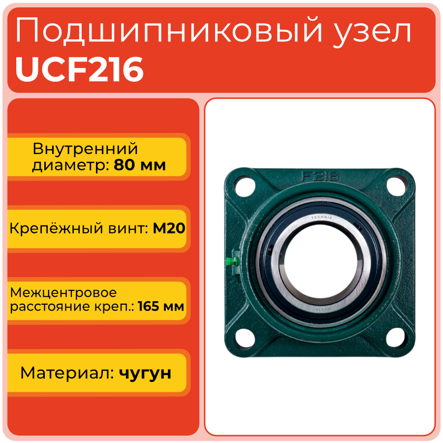 Подшипниковый узел UCF216 TECHNIX – тяжелонагруженная корпусная опора с квадратным фланцевым корпусом F216 и корпусным подшипником UC216 для вала диаметром 80 мм, рассчитанная на работу в особо тяжелых условиях эксплуатации.