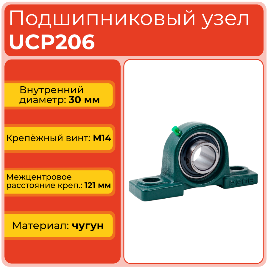 Узел включает чугунный корпус P206 с двумя крепежными отверстиями и корпусный подшипник UC206 с удлиненным внутренним кольцом и фиксирующими винтами. Встроенная тавотница под углом 45 градусов и уплотнения обеспечивают подачу смазки и защиту дорожек качения от пыли и других загрязнений.