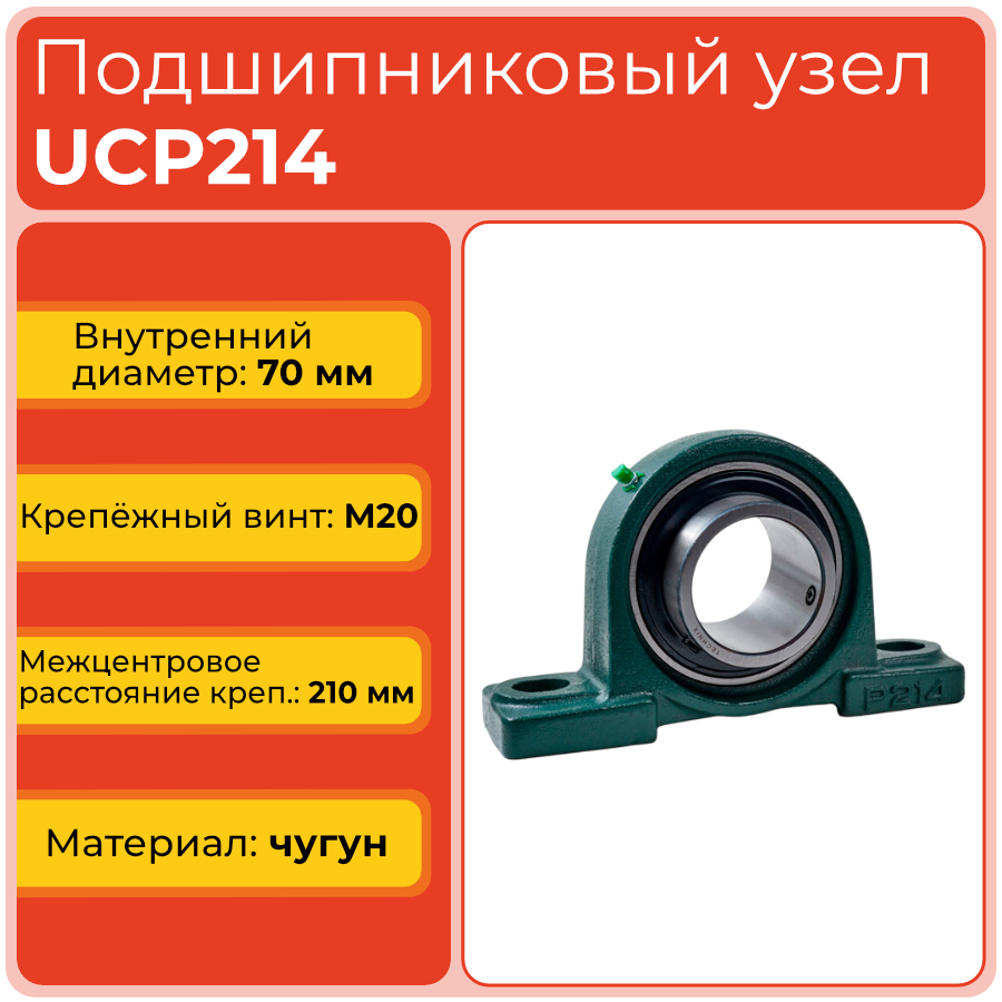 UCP214 применяют как опору валов в мощных высоконагруженных агрегатах: конвейеров большой грузоподъемности, буровых установок, компрессорных станций, насосов высокого давления, редукторов и приводных механизмов тяжелой промышленности. Самоцентрирующаяся конструкция позволяет компенсировать значительные перекосы вала, облегчает монтаж и техническое обслуживание, обеспечивая надежность при высоких циклических и переменных нагрузках.