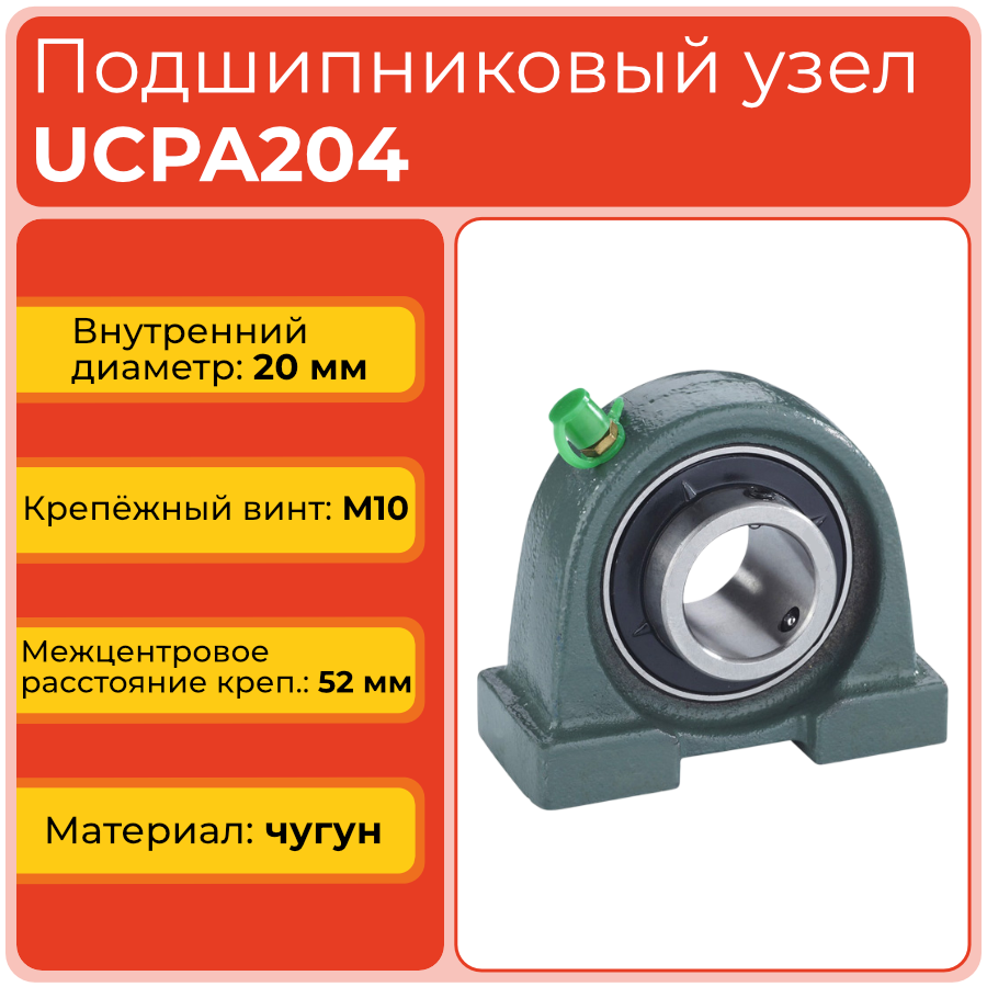 Конструкция узла UCPA204 включает корпусный подшипник UC с широким внутренним кольцом и сферической наружной обоймой, установленный в компактном чугунном корпусе PA с укороченным основанием и резьбовыми монтажными отверстиями. Сферическая посадка подшипника компенсирует небольшие перекосы вала, встроенные уплотнения и пресс-маслёнка облегчают обслуживание, а крепление корпуса выполняется болтами, вкручиваемыми в резьбовые отверстия.