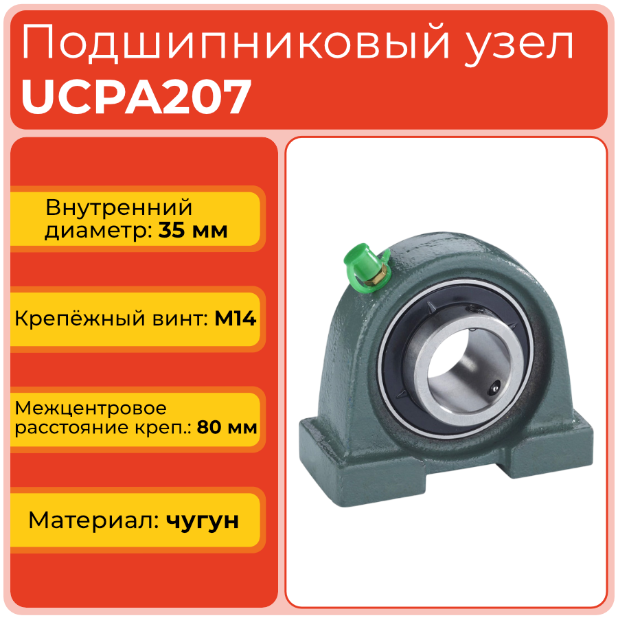 - UCPA207 – обозначение узла с укороченным основанием для вала 35 мм и высокой грузоподъёмностью.