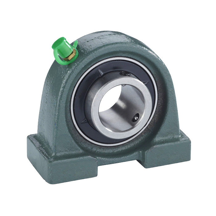 Узел UCPA208 строится на основе подшипника UC с расширенным внутренним кольцом и сферической посадкой, установленном в прочный чугунный корпус PA с компактным основанием и двумя резьбовыми отверстиями М14 для крепёжных болтов; фиксация на валу обеспечивается двумя стопорными винтами, пресс-маслёнка облегчает периодическую смазку, а герметичные уплотнители предохраняют подшипник от загрязнения.