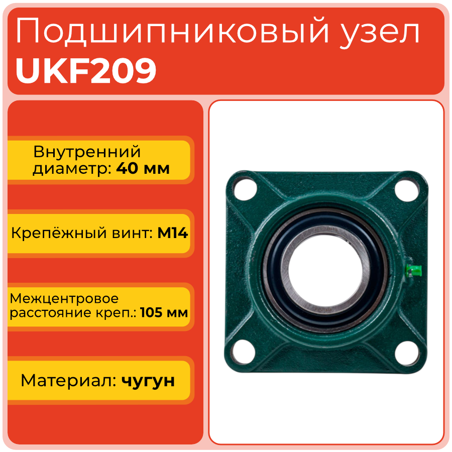 Узел UKF208 состоит из квадратного фланцевого корпуса с четырьмя отверстиями под болты, что обеспечивает надёжное крепление к несущим элементам оборудования. Корпусный подшипник UK с коническим внутренним отверстием устанавливается на вал через закрепительную втулку, которая компенсирует отклонения размеров вала и упрощает процесс монтажа без необходимости точной механической обработки посадочного места.