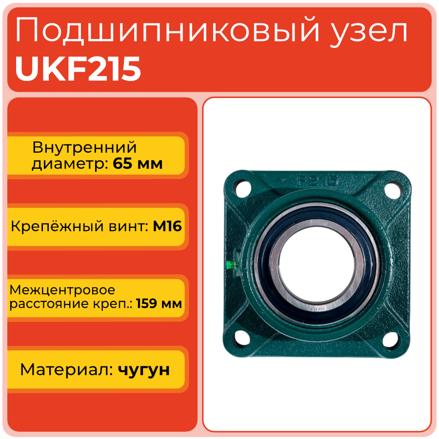 Узел UKF215 состоит из квадратного фланцевого корпуса с четырьмя отверстиями для крепления к конструкциям и основаниям. Корпусный подшипник UK с коническим внутренним отверстием устанавливается через закрепительную втулку, обеспечивая надёжное центрирование на валу, равномерное распределение нагрузок и длительный ресурс при работе в стабильных условиях.