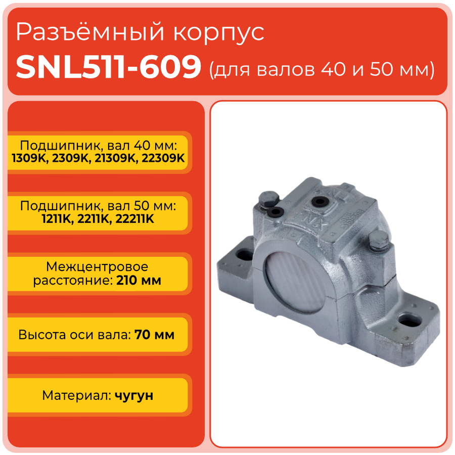 Разъемный корпус SNL511-609 – высокопрочный чугунный подшипниковый корпус стационарного типа с разъемной конструкцией для валов диаметром 50 мм. Обеспечивает надежную фиксацию и защиту самоустанавливающихся шарико- и роликоподшипников в промышленном оборудовании.