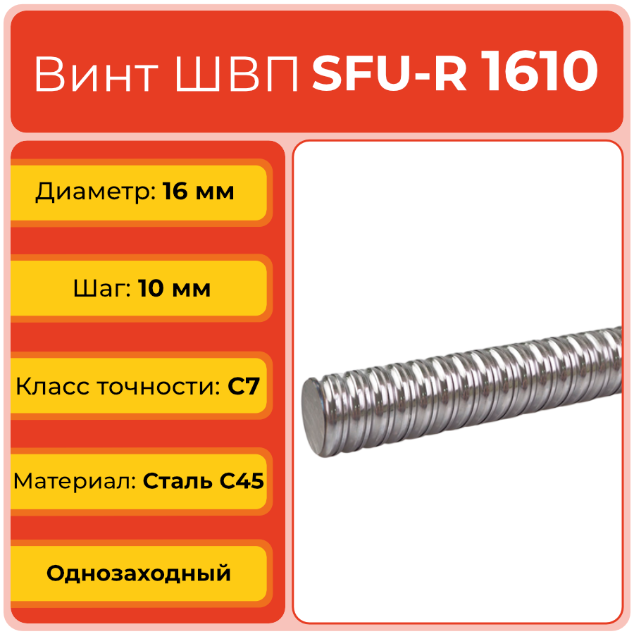 Маркировка SFU указывает на наличие устанавливаемой гайки, упрощающей монтаж и обслуживание. Буква R означает правое направление резьбы. Однозаходная геометрия позволяет достичь стабильной и плавной работы, снижая нагрузку на механизм и обеспечивая длительный срок службы. Винт SFU-R1610 сочетает компактность, лёгкость и эффективность — идеален для динамичных приложений.